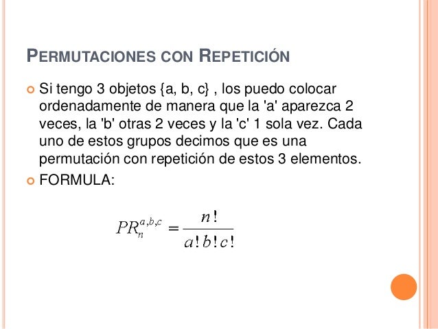 4 3. Como en toda la probabilidad básica las fórmulas nacen del conteo del número de maneras en que pueden suceder cosas específicas y comparándola con el número total de posibilidades. La permutación con repetición se usa cuando en un total de n elementos el primero se repite a veces el segundo b veces el tercero c veces.