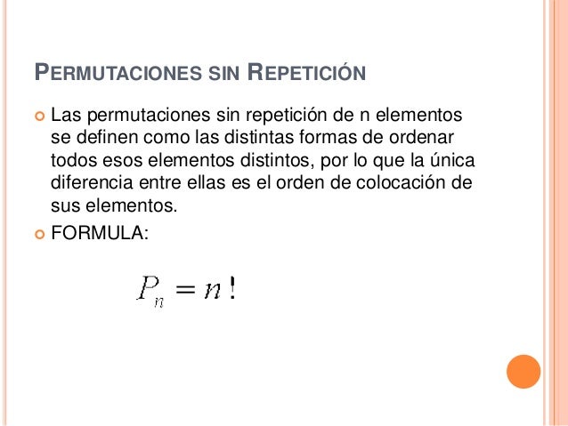 Donde n es el número de elementos del conjunto. Una permutación es un arreglo ordenado de objetos de un grupo sin repeticiones. Para calcular el número de permutaciones podemos emplear la siguiente fórmula.