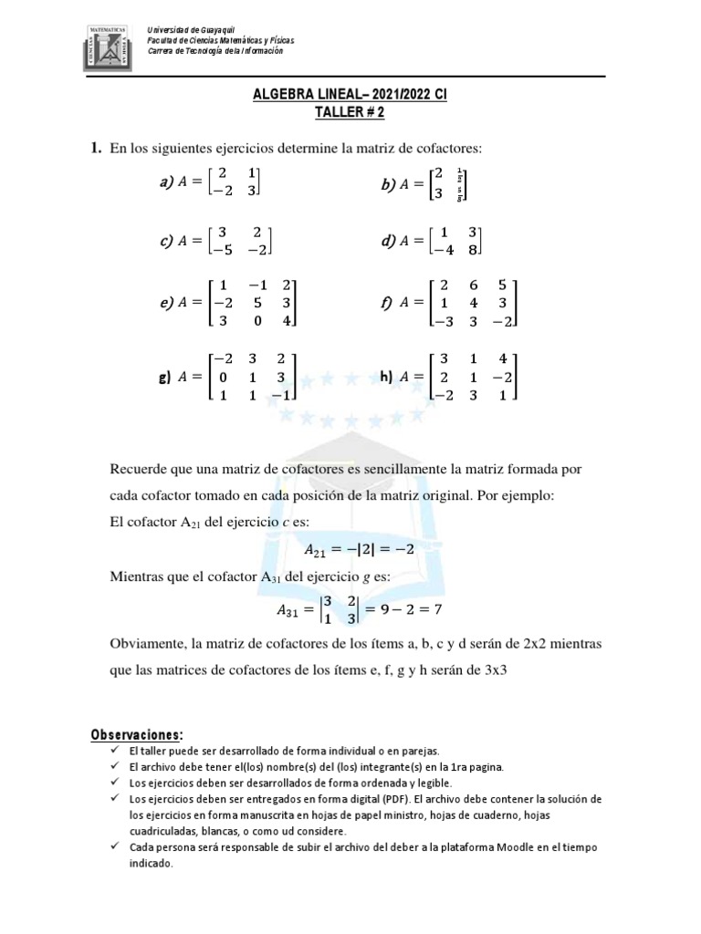 Taller 2 Matriz De Cofactores Pdf Matriz Matematicas Fisica Teorica